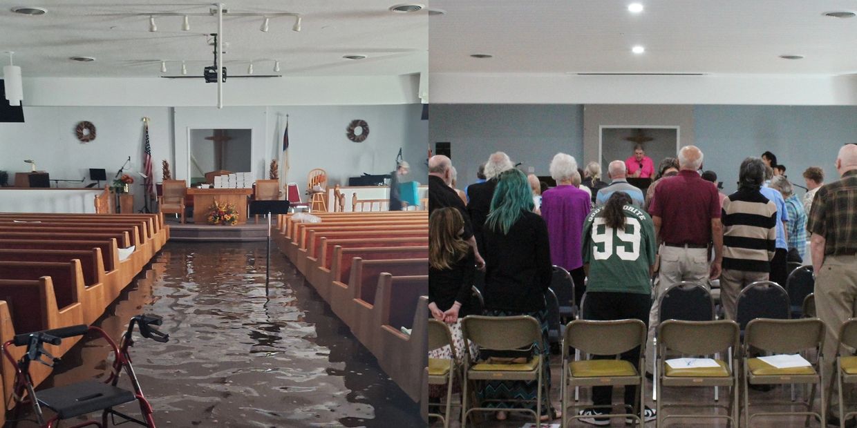 Look at what God has done! We've gone from a completely flooded and unusable building to being able to worship with each other again here. The Lord has provided every step of the way, both materially and with people willing to serve. And, He has done so in abundance. Even though we still have some ways to go before we are finished, we are back. Praise the Lord!